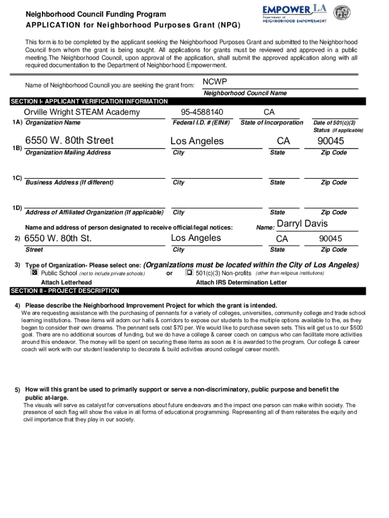 Neighborhood Council Funding Program APPLICATION for Neighborhood Purposes Grant (NPG) This form is to be completed by the applicant seeking the Neighborhood Purposes Grant and submitted to the Neighborhood