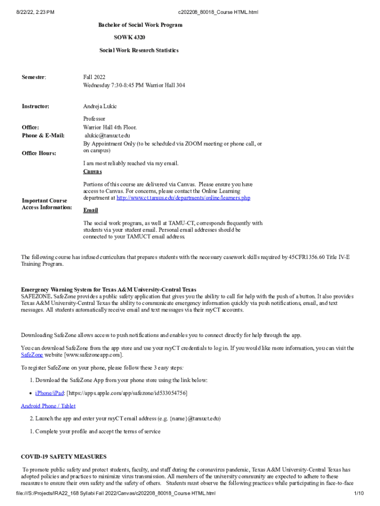8/22/22, 2:23 PMc202208_80018_Course HTML.html Bachelor of Social Work Program SOCK 4320 Social Work Research Statistics Semester: Fall 2022 Wednesday 7:308:45 PM Warrior Hall 304 Instructor:Andrea