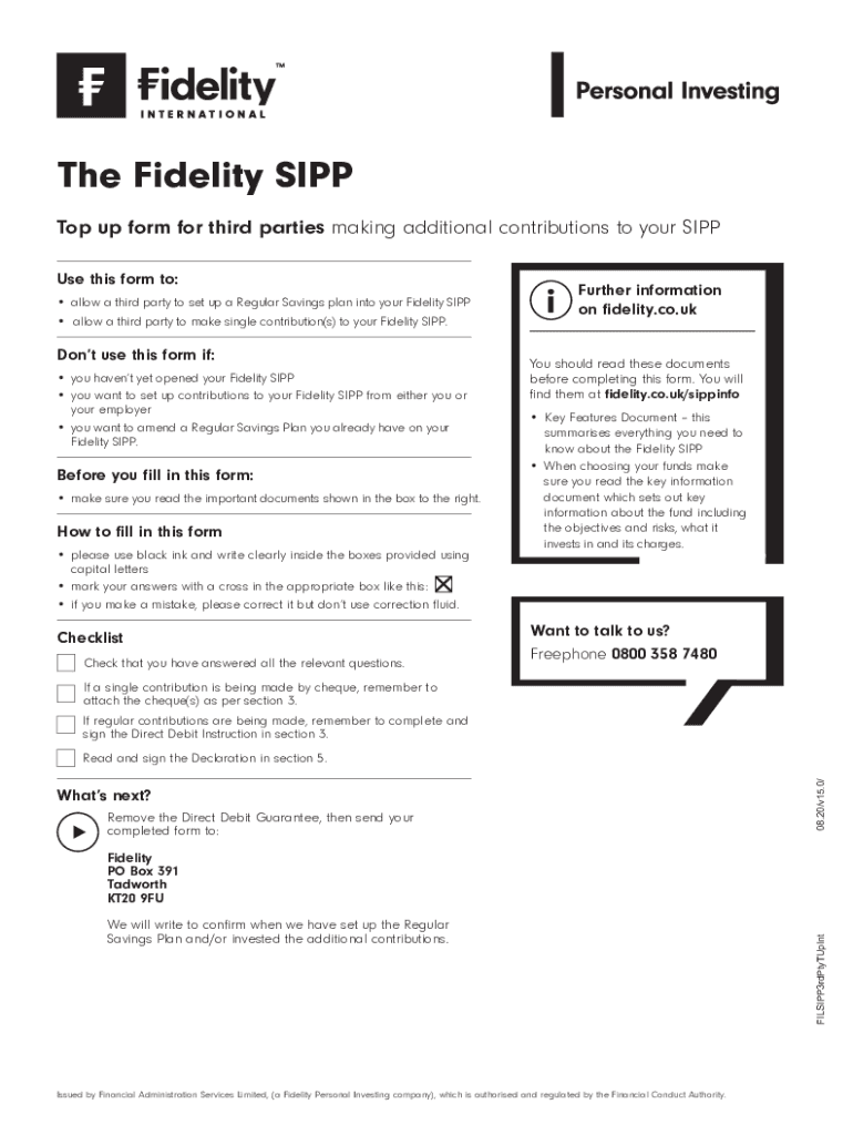 The Fidelity SIPP Top up form for third parties making additional contributions to your SIPP Use this form to: allow a third party to set up a Regular Savings plan into your Fidelity SIPP allow a