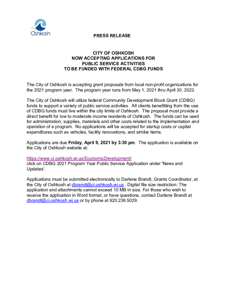 PRESS RELEASECITY OF OSHKOSH NOW ACCEPTING APPLICATIONS FOR PUBLIC SERVICE ACTIVITIES TO BE FUNDED WITH FEDERAL CBG FUNDS The City of Oshkosh is accepting grant proposals from local nonprofit organizations