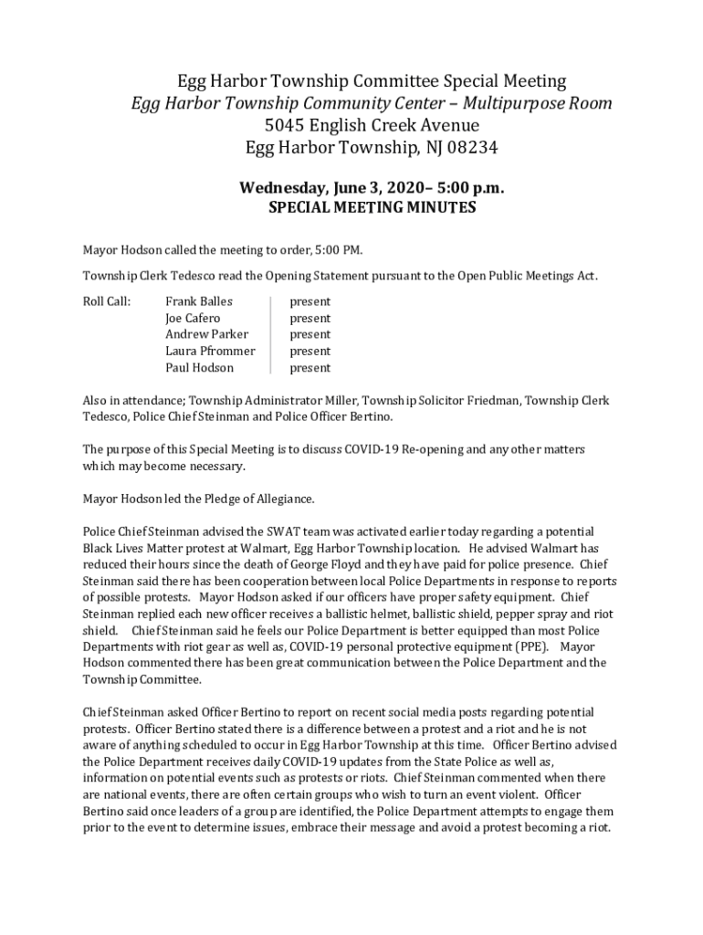 Egg Harbor Township Committee Special Meeting Egg Harbor Township Community Center Multipurpose Room 5045 English Creek Avenue Egg Harbor Township, NJ 08234 Wednesday, June 3, 2020 5:00 p.m. SPECIAL