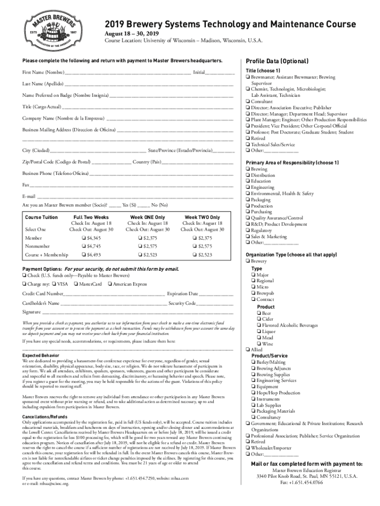 2019 Brewery Systems Technology and Maintenance Course August 18 30, 2019Course Location: University of Wisconsin Madison, Wisconsin, U.S.A. Please complete the following and return with payment to