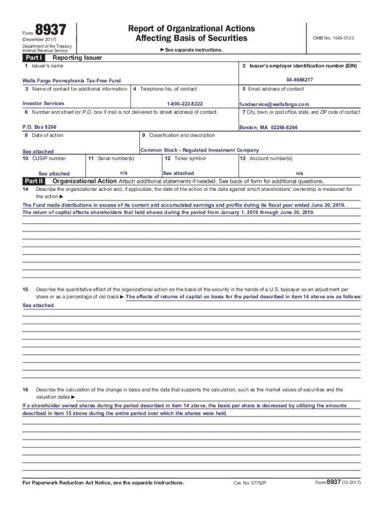 8937Report of Organizational Actions Affecting Basis of SecuritiesForm (December 2017) Department of the Treasury Internal Revenue Serviceman Ia See separate instructions. Reporting Issuer1 Issuer\'s