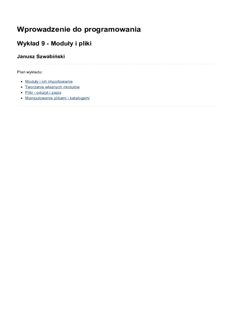 Wprowadzeniedoprogramowania Wykad9Moduyipliki JanuszSzwabiski Planwykadu: Moduyiichimportowanie Tworzeniewasnychmoduw Plikiodczytizapis ManipulowanieplikamiikatalogamiModuyiichimportowanie skryptywPythonielubkodskompilowanynp.wC/C++