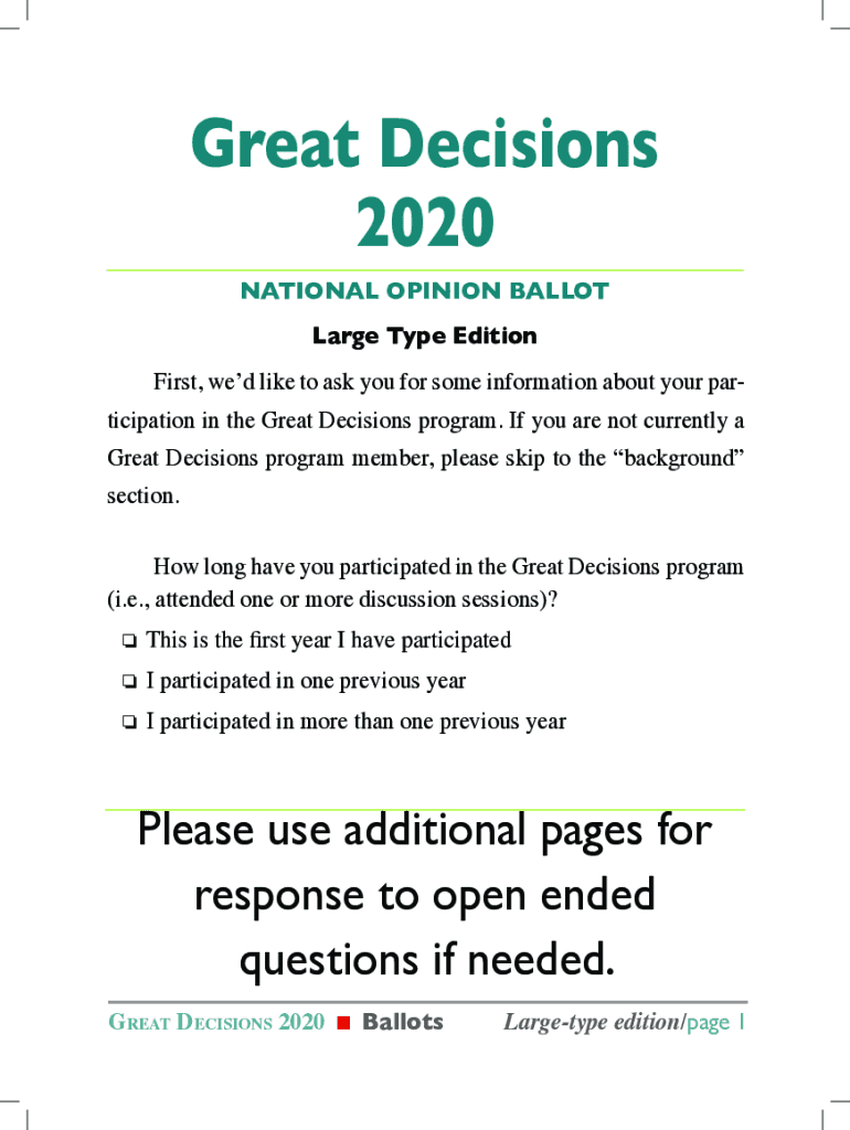 Great Decisions 2020 NATIONAL OPINION BALLOT Large Type Edition First, we'd like to ask you for some information about your participation in the Great Decisions program. If you are not currently great