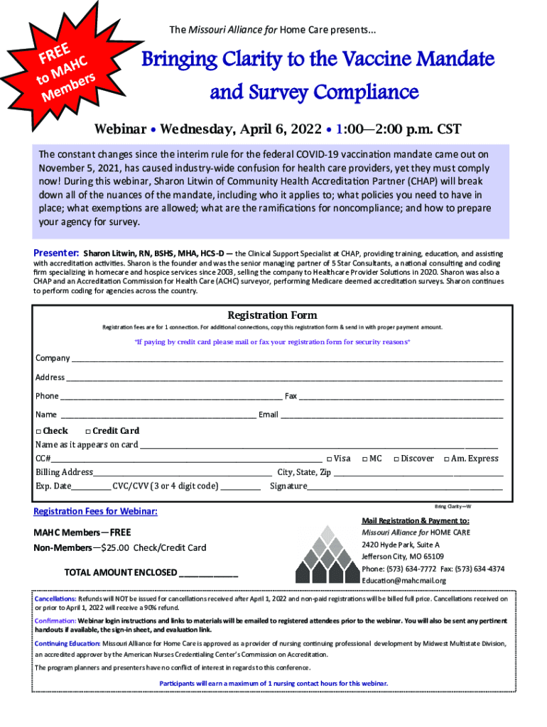 The Missouri Alliance for Home Care presents... Bringing Clarity to the Vaccine Mandate and Survey Compliance Webinar Wednesday, April 6, 2022 1:002:00 p.m. CST The constant changes since the interim