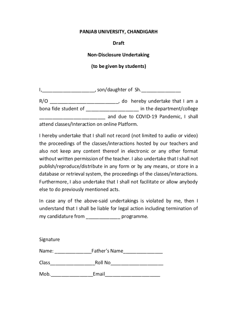 PUNJAB UNIVERSITY, CHANDIGARH Draft Nondisclosure Undertaking (to be given by students)I, ___, son/daughter of Sh.___ R/O ___, do hereby undertake that I am a bona fide student of ___ in the department/college
