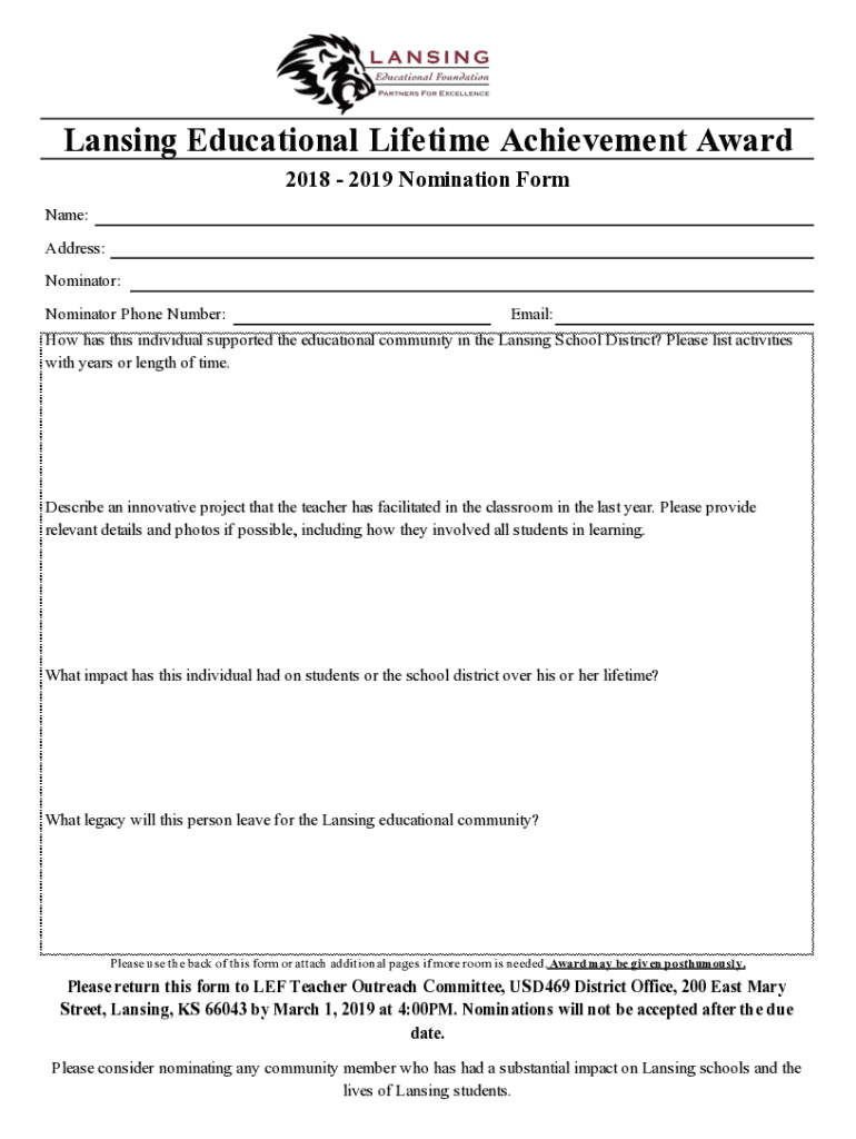 Lansing Educational Lifetime Achievement Award 2018 2019 Nomination Form Name: Address: Nominator: Nominator Phone Number: Email: How has this individual supported the educational community in the