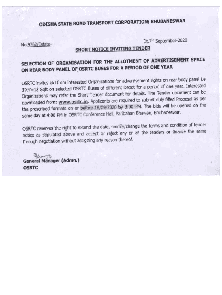 ODISHA STATE ROAD TRANSPORT CORPORATIONSHORT TENDER NOTIFICATION NO:9762 /2020TENDER DOCUMENT FOR SELECTION OF Organization