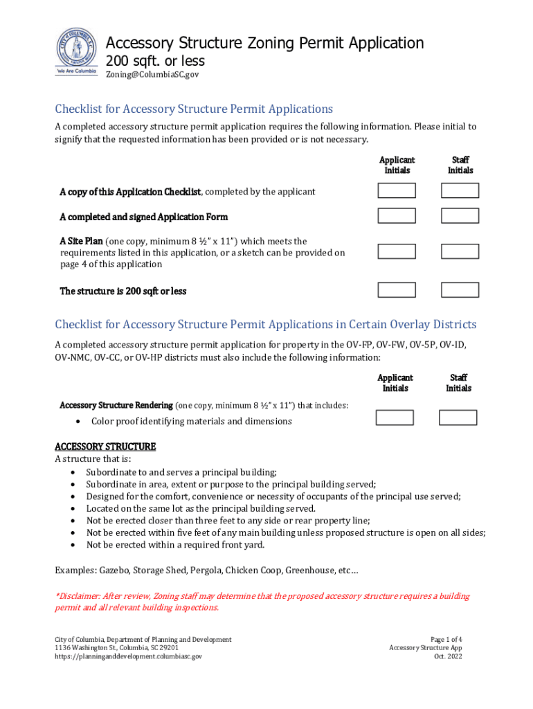 Accessory Structure Zoning Permit Application 200 soft. Or less Zoning@ColumbiaSC.govChecklist for Accessory Structure Permit Applications A completed accessory structure permit application requires