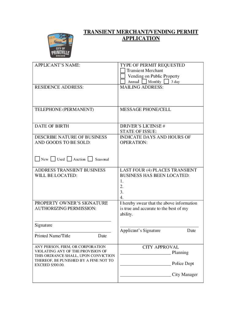 TRANSIENT MERCHANT/VENDING PERMIT APPLICATIONAPPLICANTS NAME:RESIDENCE ADDRESS:TYPE OF PERMIT REQUESTED Transient Merchant Vending on Public Property Annual Monthly 3 day MAILING ADDRESS:TELEPHONE