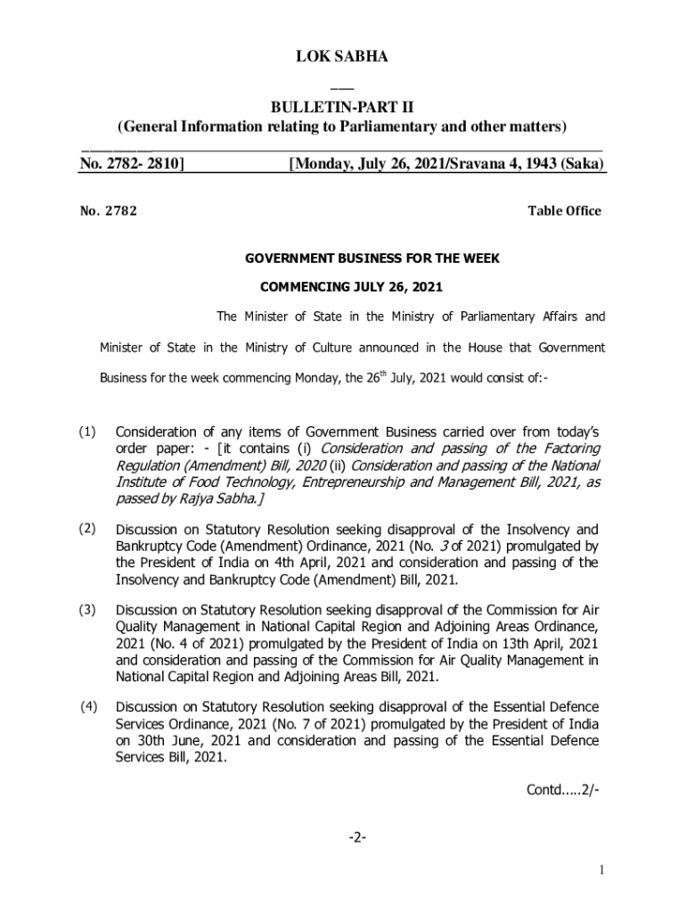 OK SASHA ___ BULLETINPART II (General Information relating to Parliamentary and other matters) ___ No. 2782 2810] [Monday, July 26, 2021/Havana 4, 1943 (Aka) No. 2782Table Office GOVERNMENT BUSINESS