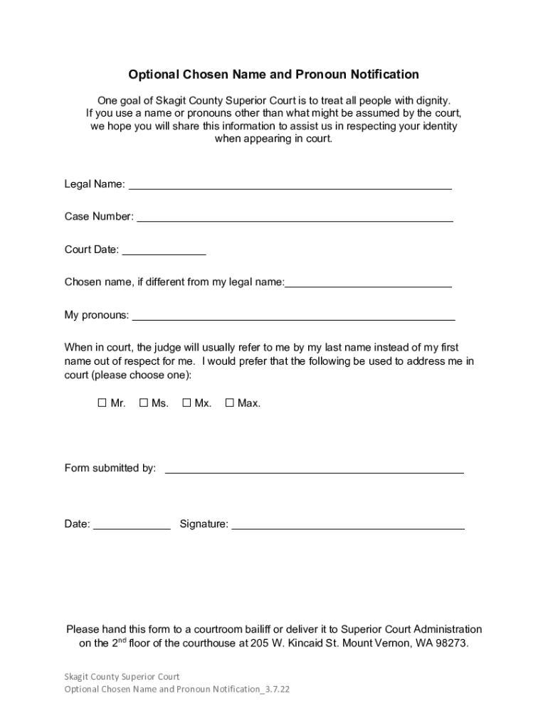 Optional Chosen Name and Pronoun Notification One goal of Skagit County Superior Court is to treat all people with dignity. If you use a name or pronouns other than what might be assumed by the court,