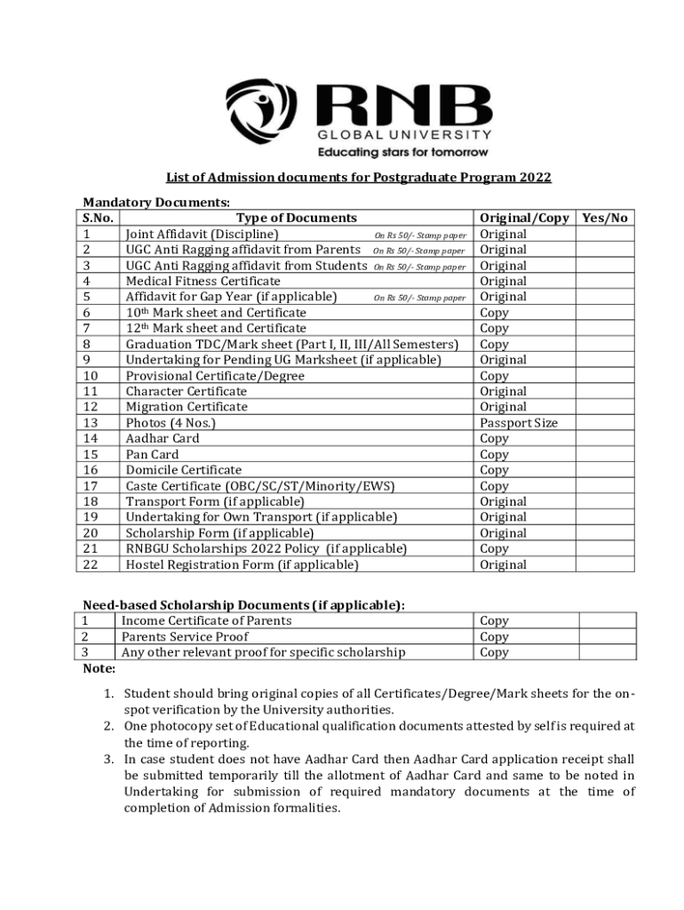 List of Admission documents for Postgraduate Program 2022 Mandatory Documents: S. No. Type of Documents 1 Joint Affidavit (Discipline) On Rs 50/ Stamp paper 2 UGC Anti Ragging affidavit from Parents