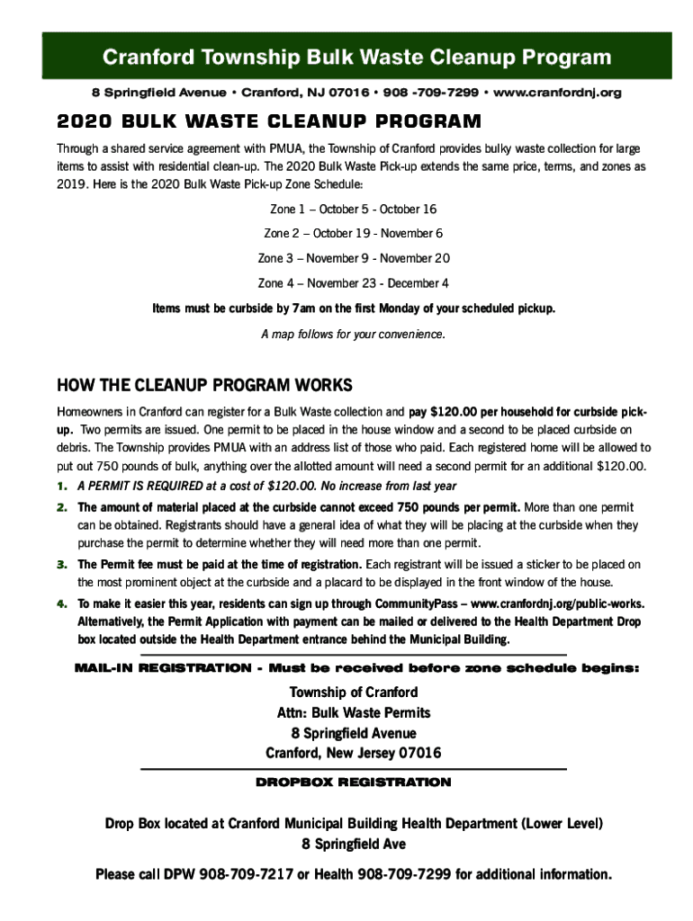 Cranford Township Bulk Waste Cleanup Program 8 Springfield Avenue Cranford, NJ 07016 908 7097299 www.cranfordnj.org2020 BULK WASTE CLEANUP PROGRAM Through a shared service agreement with PMA, the