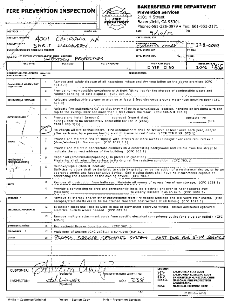 BAKERSFIELD FIRE DEPARTMENTALIZE PREVENTION INSPECTIONPrevention Services 2101 H Street Bakersfield, CA 93301 Phone: 661 326 3979 Fax: 661 852 2171 DATEBOOK NO.DISTRICT EE0 / CITY, STATE, FACILITY