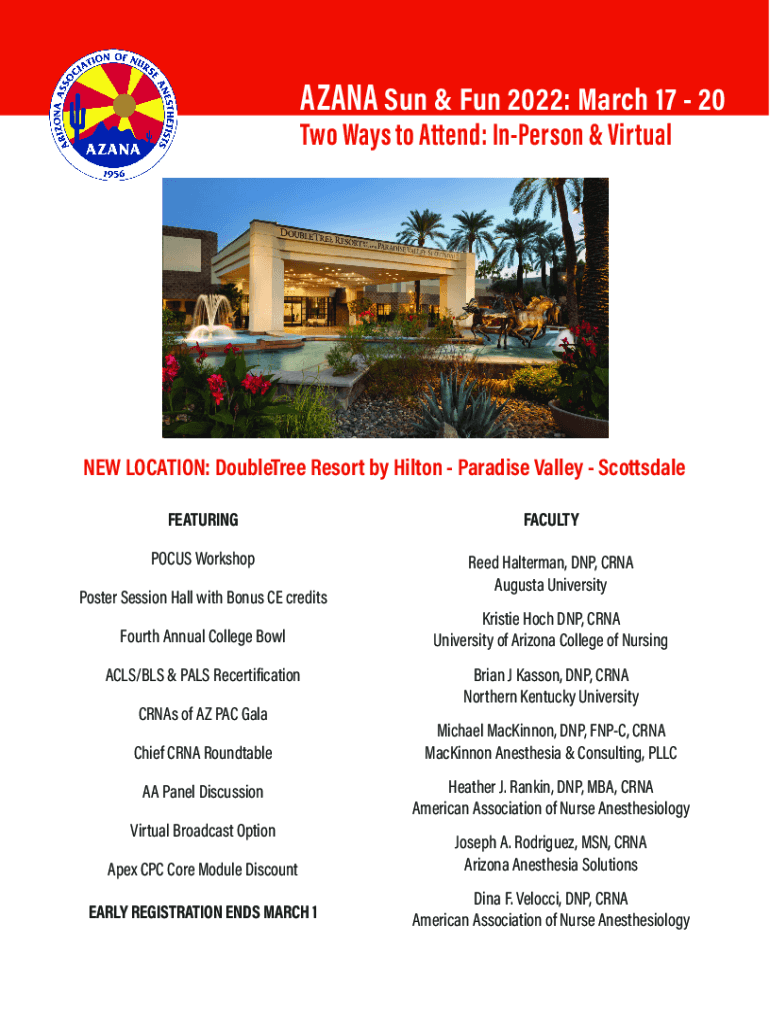 AZANA Sun & Fun 2022: March 17 20 Two Ways to Attend: Unperson & Virtual LOCATION: Doublet Resort by Hilton Paradise Valley Scottsdale FEATURINGFACULTYPOCUS Workshop Reed Halter man, DNP, CRNA Augusta