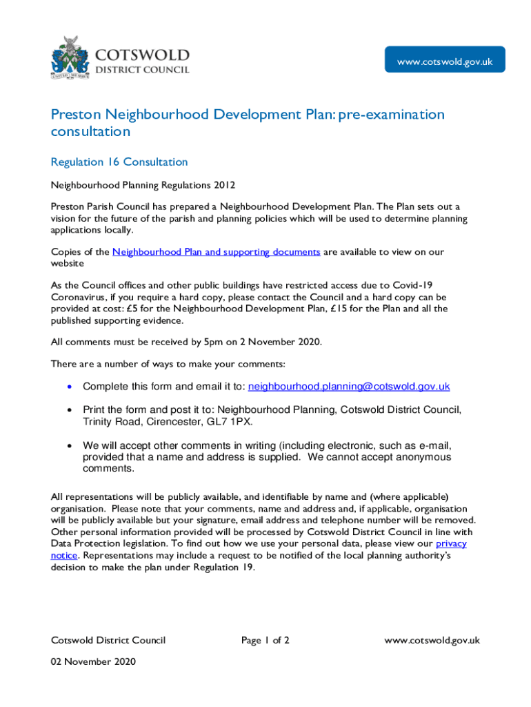 WWW.Cotswold.gov. Preston Neighborhood Development Plan: reexamination consultation Regulation 16 Consultation Neighborhood Planning Regulations 2012 Preston Parish Council has prepared a Neighborhood
