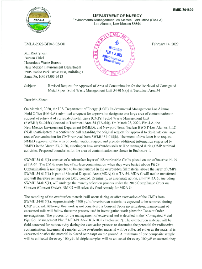 EMID701890DEPARTMENT OF ENERGY Environmental Management Los Alamos Field Office (EMMA) Los Alamos, New Mexico 87544EMLA2022BF04602001February 14, 2022Mr. Rick Sean Bureau Chief Hazardous Waste Bureau