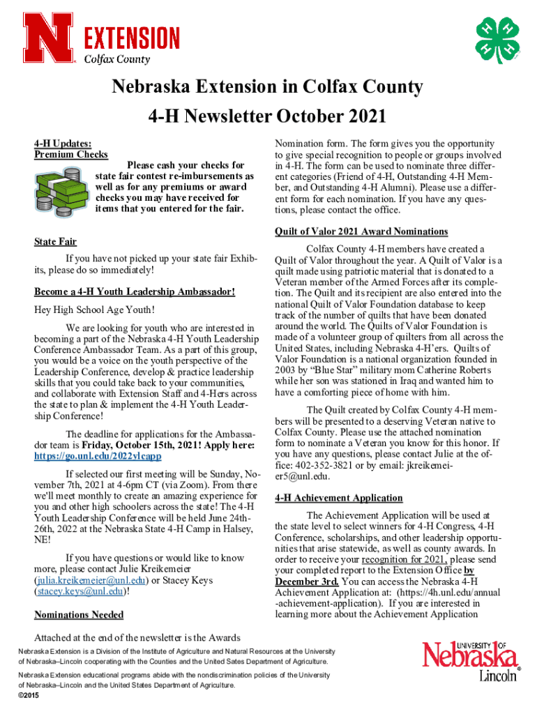 Nebraska Extension in Colfax County 4H Newsletter October 2021 4H Updates: Premium ChecksPlease cash your checks for state fair contest reimbursements as well as for any premiums or award checks you