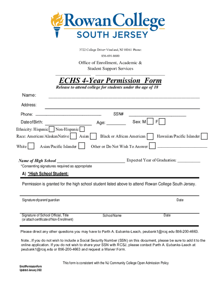 3722 College Drive Vineland, NJ 08361 Phone: 8566918600Office of Enrollment, Academic & Student Support ServicesECHS 4Year Permission Form Release to attend college for students under the age of 18Name:___Address: