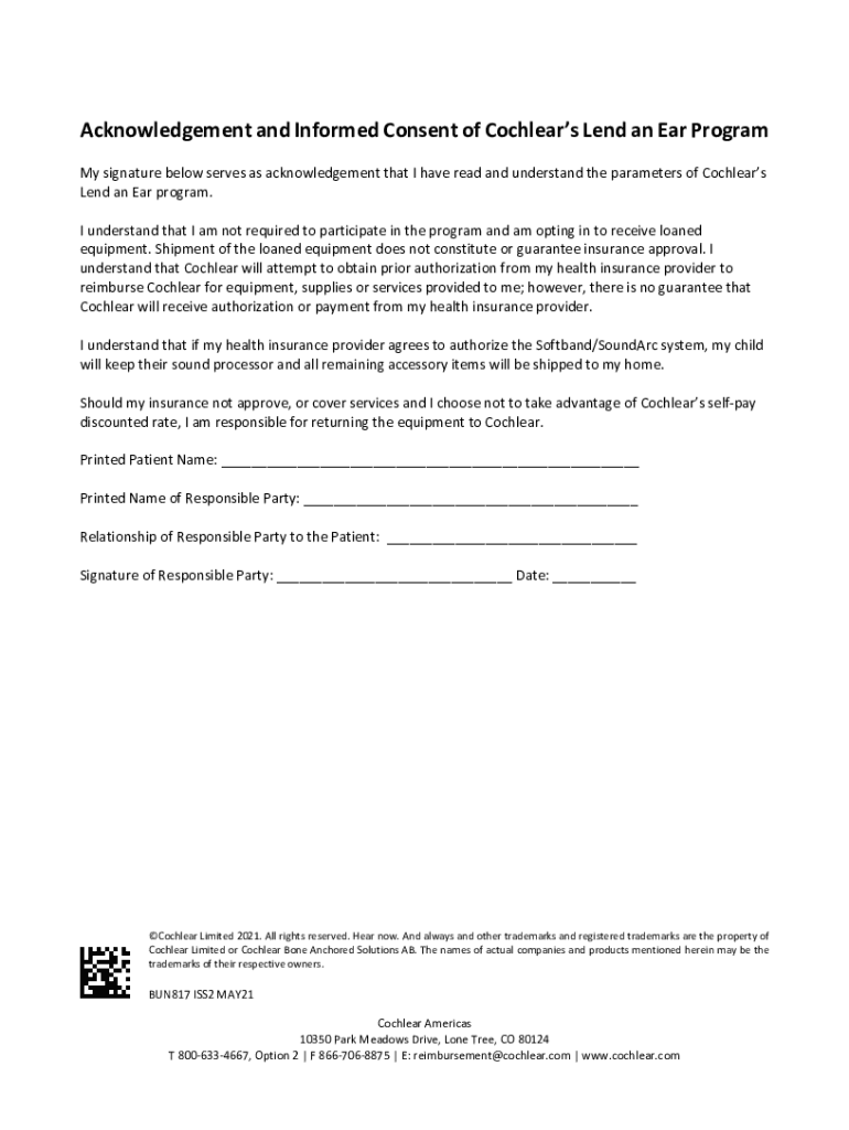 Cochlear Lend an Ear Program Dear Family, Thank you for your interest in choosing Cochlear Soft band/Boundary system for your children needs. Cochlear recognizes the importance of providing early