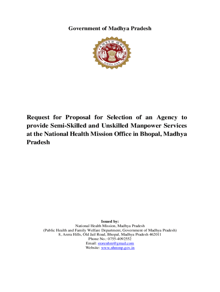 Government of Madhya PradeshRequest for Proposal for Selection of an Agency to provide Semiskilled and Unskilled Manpower Services at the National Health Mission Office in Bhopal, Madhya PradeshIssued