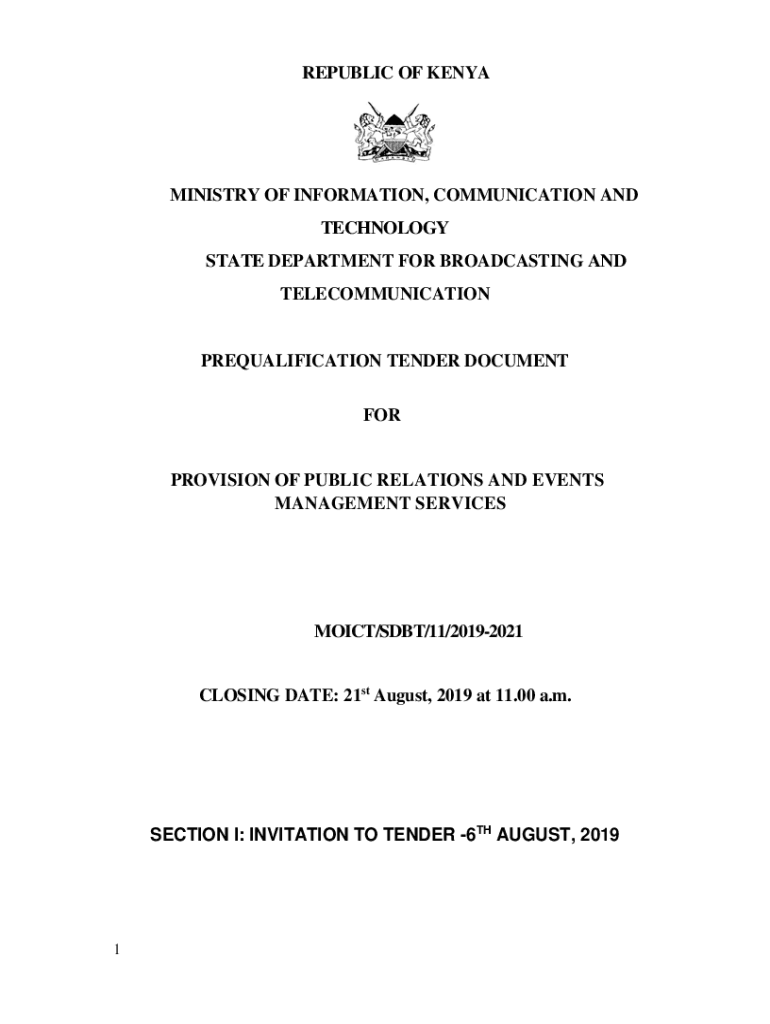 REPUBLIC OF KENYAMINISTRY OF INFORMATION, COMMUNICATION AND TECHNOLOGY STATE DEPARTMENT FOR BROADCASTING AND TELECOMMUNICATIONPREQUALIFICATION TENDER DOCUMENT PROVISION OF PUBLIC RELATIONS AND EVENTS