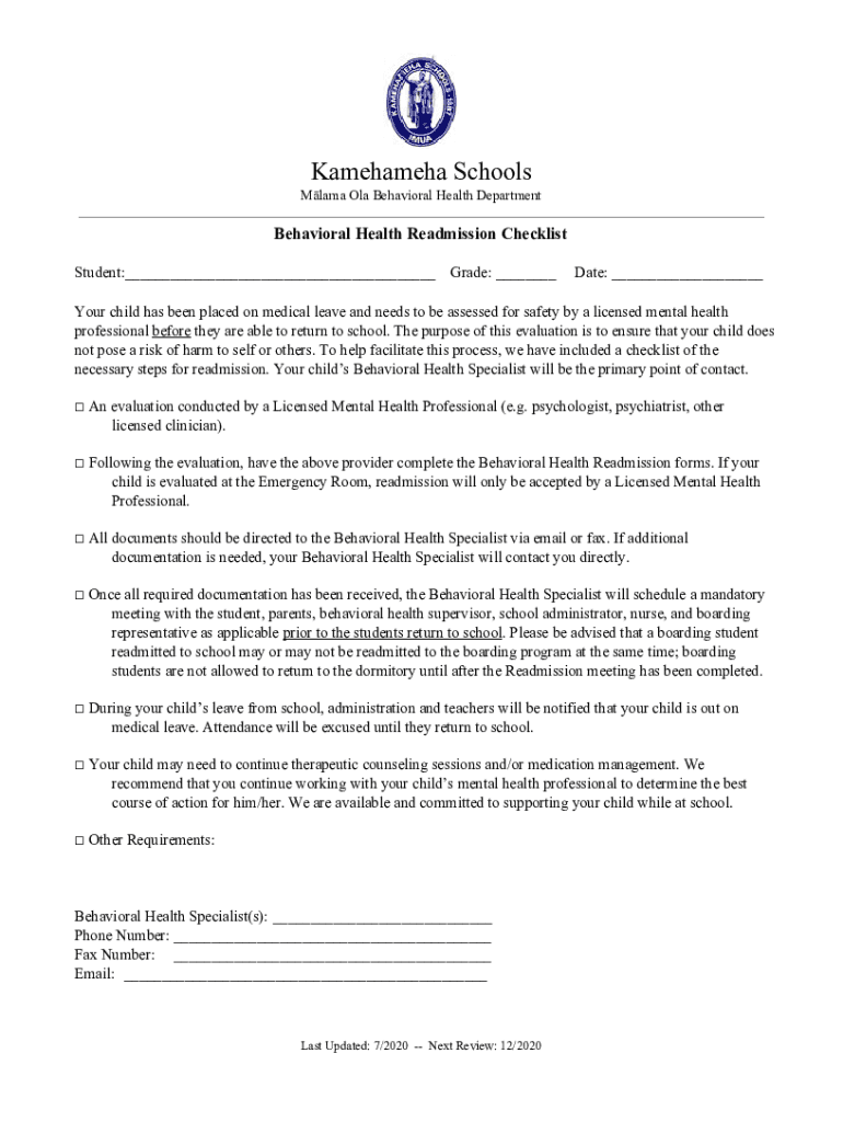 Kamehameha Schools Lama Ola Behavioral Health DepartmentBehavioral Health Readmission Checklist Student:___ Grade: ___Date: ___Your child has been placed on medical leave and needs to be assessed