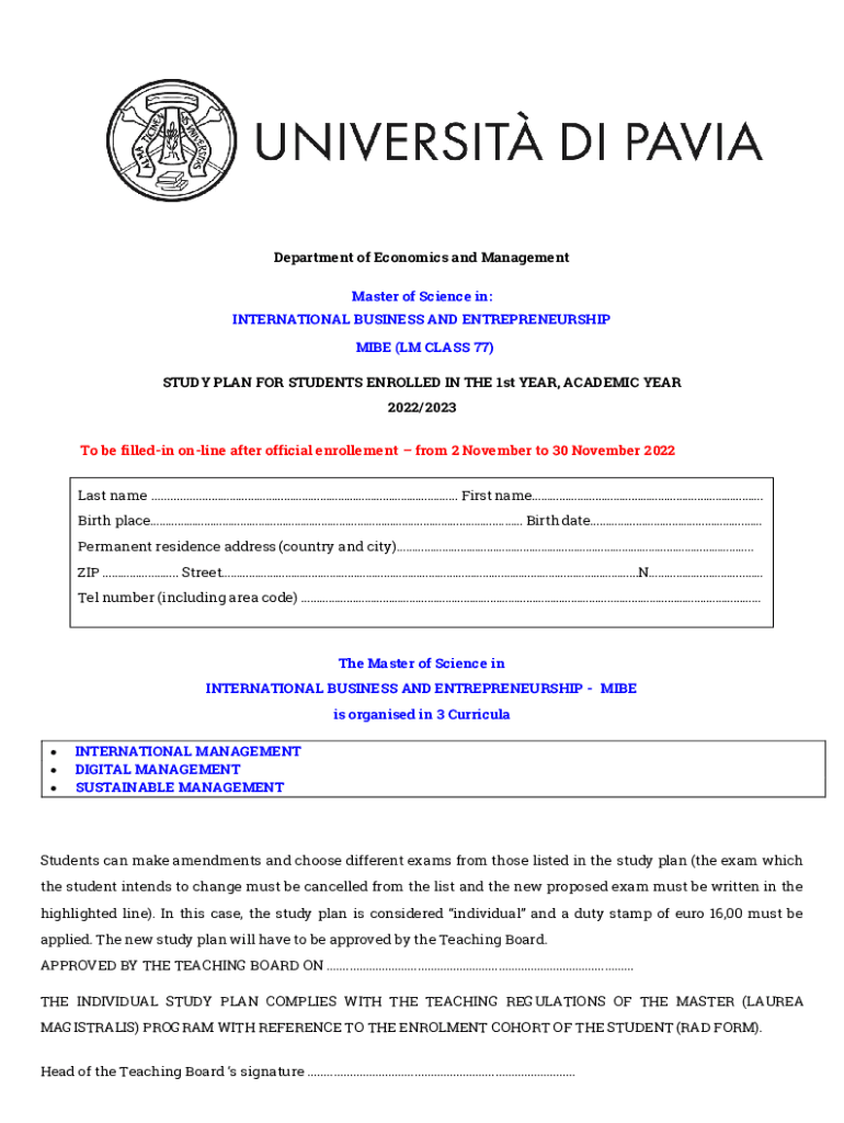 Department of Economics and Management Master of Science in: INTERNATIONAL BUSINESS AND ENTREPRENEURSHIP MILE (LM CLASS 77) STUDY PLAN FOR STUDENTS ENROLLED IN THE 1st YEAR, ACADEMIC YEAR 2022/2023