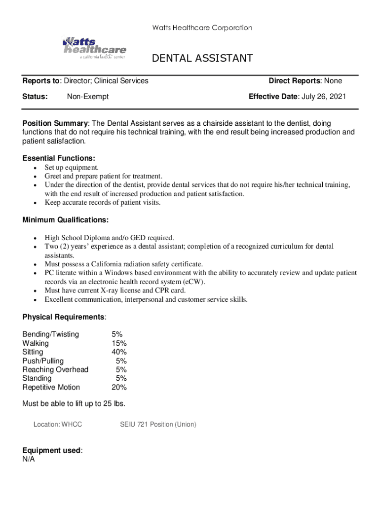 Watts Healthcare CorporationDENTAL ASSISTANT Reports to: Director; Clinical Services Status:NonExemptDirect Reports: None Effective Date: July 26, 2021Position Summary: The Dental Assistant serves