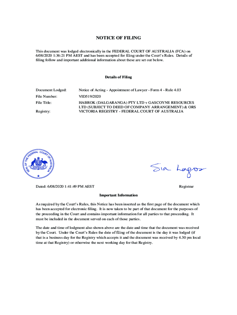 NOTICE OF FILING This document was lodged electronically in the FEDERAL COURT OF AUSTRALIA (FCA) on 6/08/2020 1:36:21 PM AEST and has been accepted for filing under the Courts Rules. Details of filing