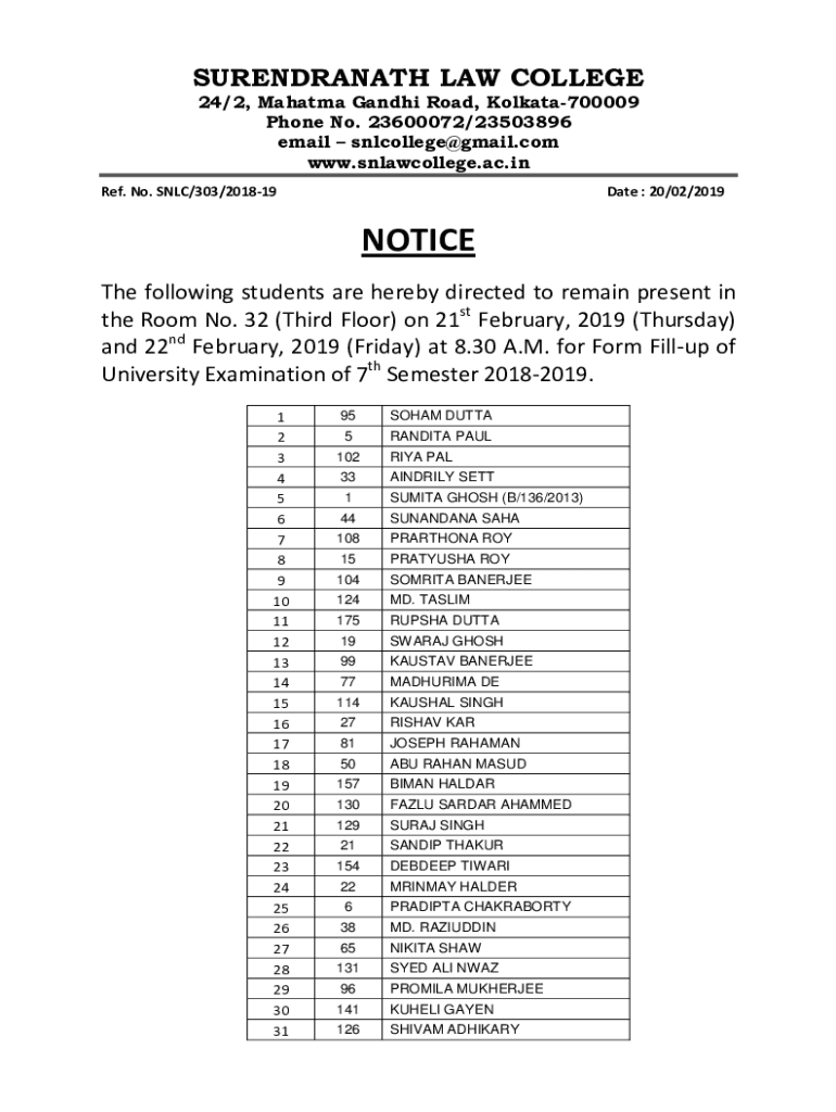 SURENDRANATH LAW COLLEGE 24/2, Mahatma Gandhi Road, Kolkata700009 Phone No. 23600072/23503896 email snlcollege@gmail.com www.snlawcollege.ac.in Ref. No. SNL/303/201819Date : 20/02/2019NOTICE The following