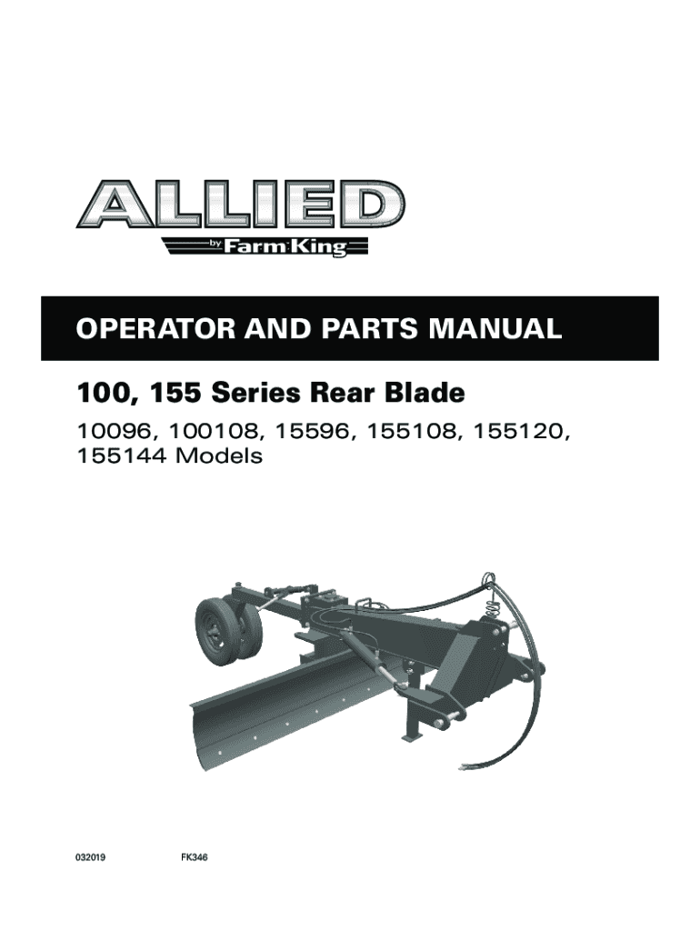 OPERATOR AND PARTS MANUAL 100, 155 Series Rear Blade 10096, 100108, 15596, 155108, 155120, 155144 Models032019FK346100, 155 Series Rear Lamentable Of Contents Manufacturers Statement: For technical
