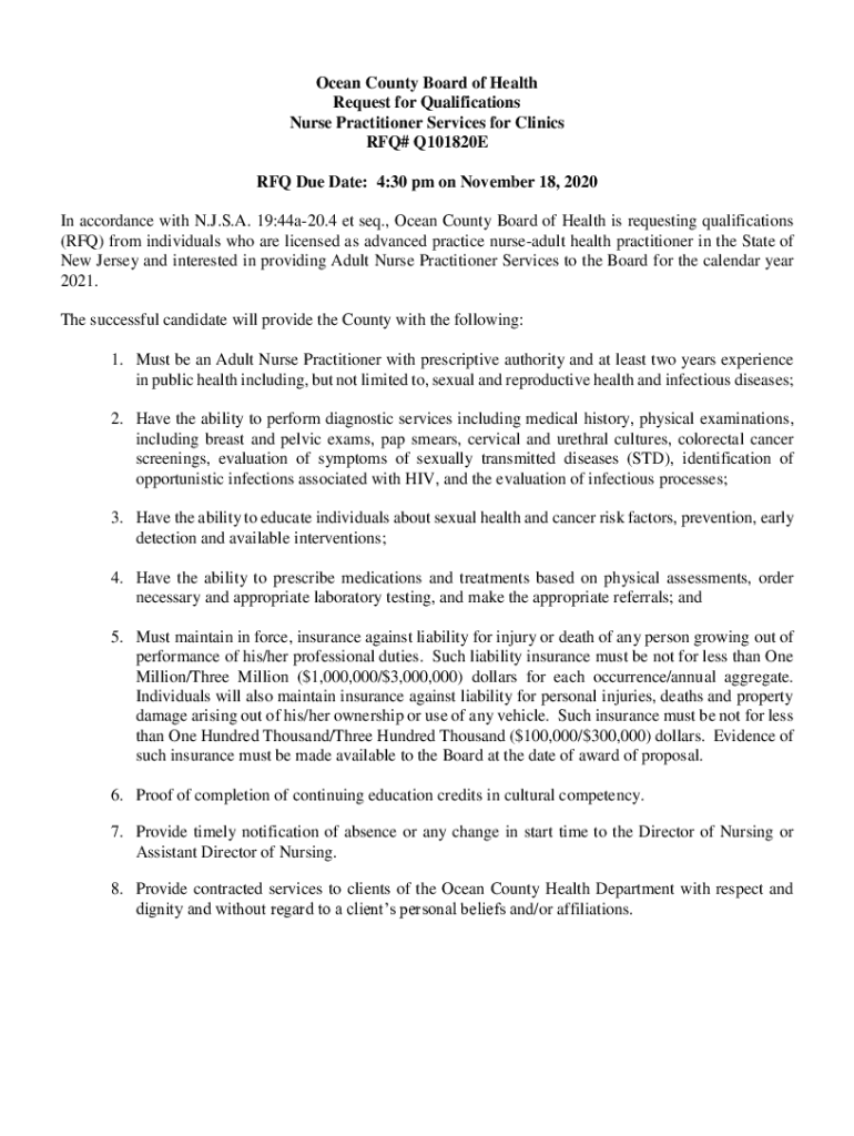 Ocean County Board of Health Request for Qualifications Nurse Practitioner Services for Clinics RFQ# Q101820E RFQ Due Date: 4:30 pm on November 18, 2020, In accordance with N.J.S.A. 19:44a20.4 et