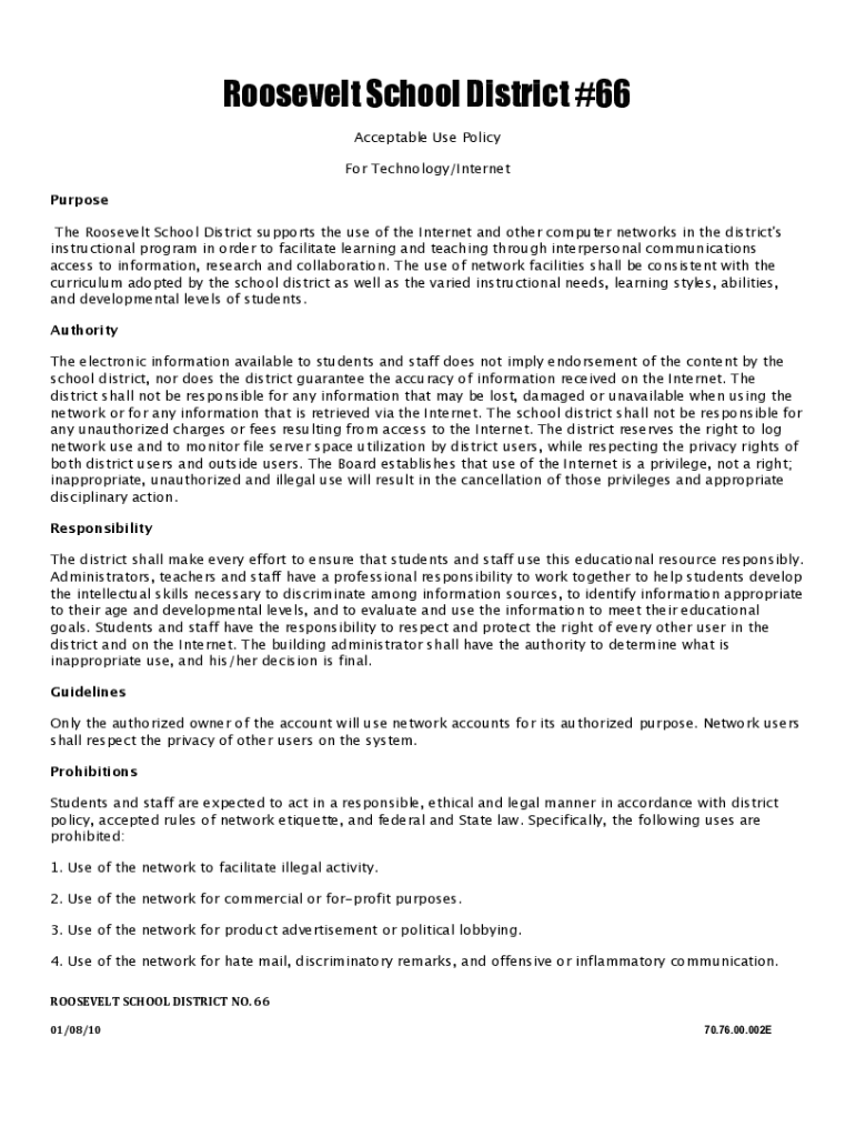 Roosevelt School District #66 Acceptable Use Policy For Technology/Internet Purpose The Roosevelt School District supports the use of the Internet and other computer networks in the district\'s instructional