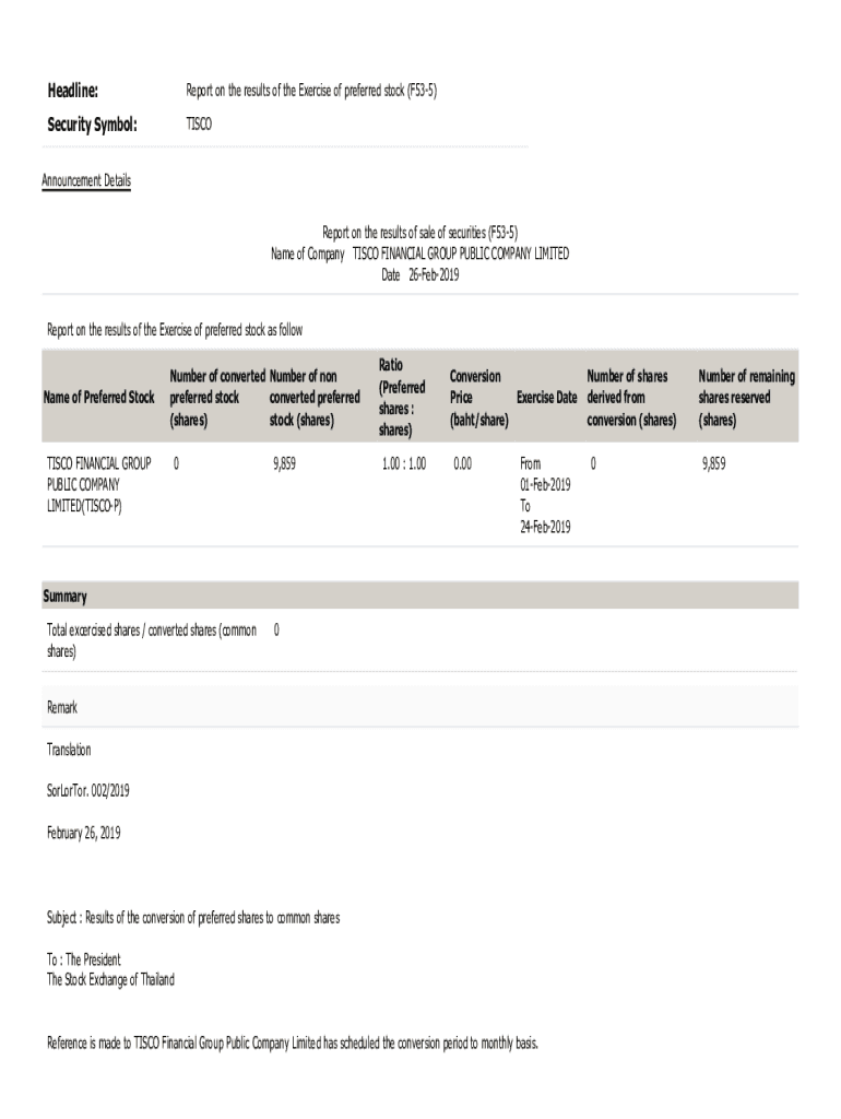 Headline:Report on the results of the Exercise of preferred stock (F535)Security Symbol:TISCOAnnouncement Details