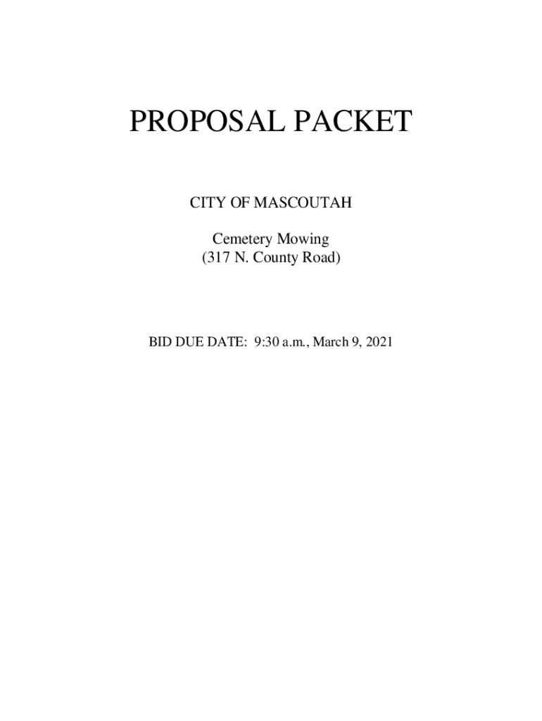PROPOSAL PACKET CITY OF MASCOT Cemetery Mowing (317 N. County Road)BID DUE DATE: 9:30 a.m., March 9, 20211. Proposal Packets and Specifications will be available in the office of the City Clerk, 3