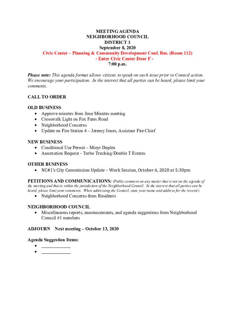 MEETING AGENDA NEIGHBORHOOD COUNCIL DISTRICT 1 September 8, 2020, Civic Center Planning & Community Development Cone. Rm. (Room 112) Enter Civic Center Door F 7:00 p.m. Please note: This agenda formats