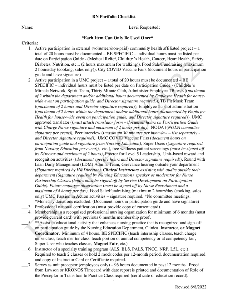RN Portfolio Checklist Name: ___Level Requested: ___*Each Item Can Only Be Used Once* Criteria: ___1. Active participation in external (volunteer/nonpaid) community health affiliated project a total