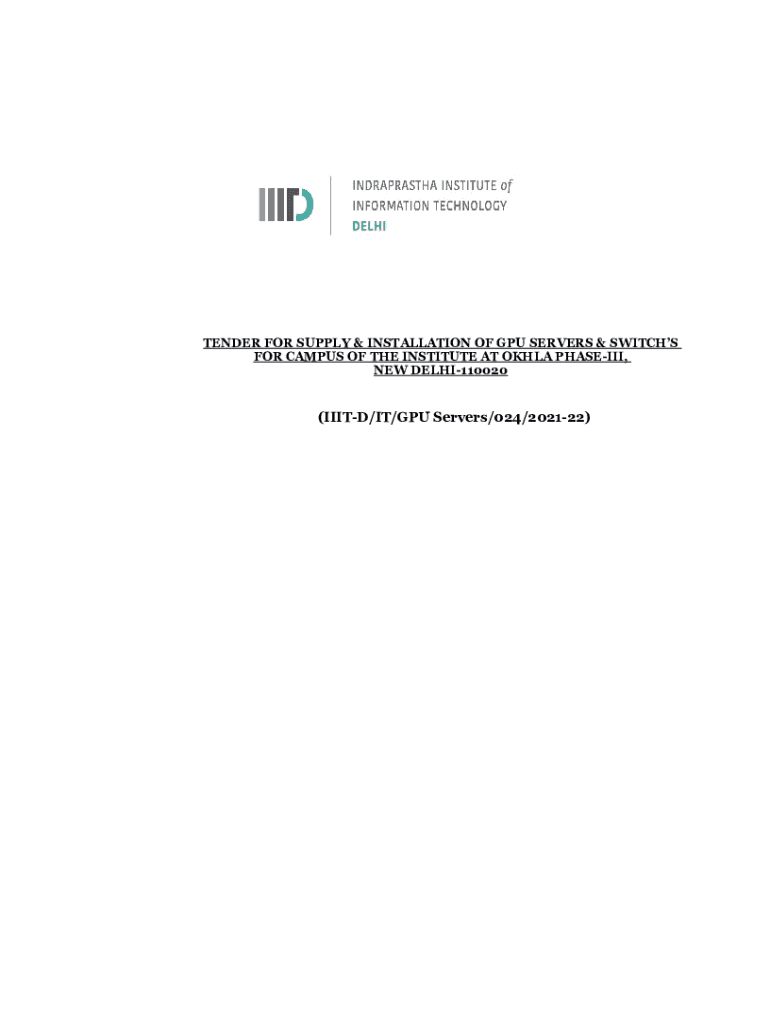 TENDER FOR SUPPLY & INSTALLATION OF GPU SERVERS & SWITCH FOR CAMPUS OF THE INSTITUTE AT OKLA PHASE, NEW DELHI110020(III TD/IT/GPU Servers/024/202122)INVITATION FOR BIDSIndraprastha Institute of Information
