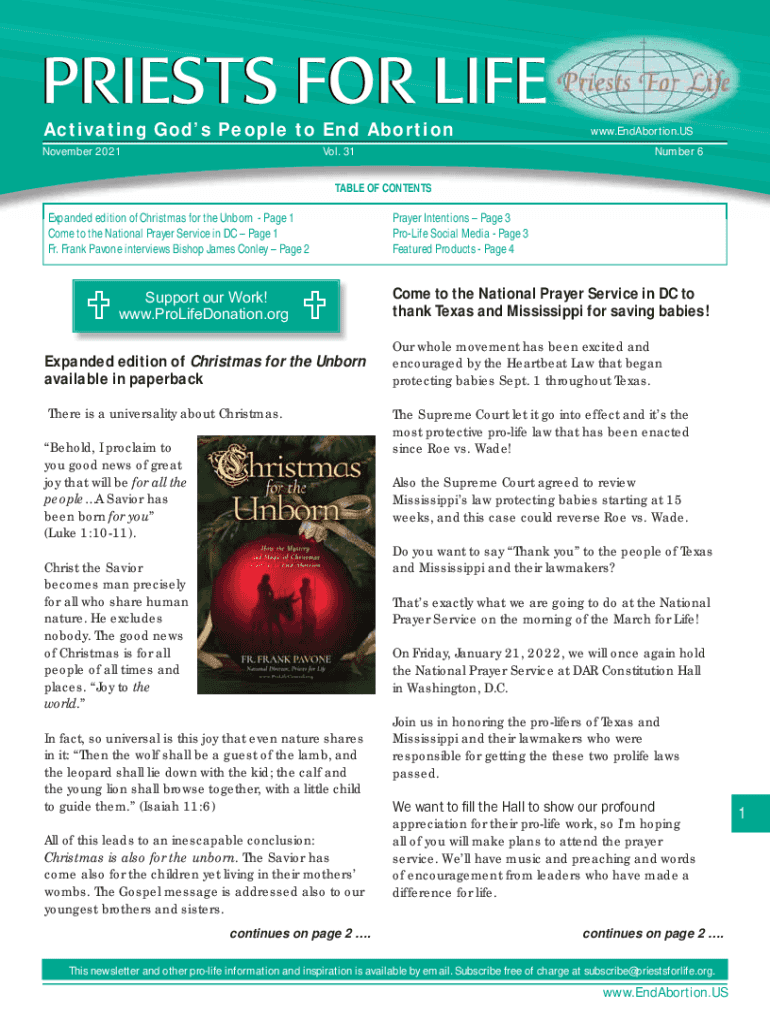 Activating Gods People to End Abortion November 2021Vol. 31www. Abortion.US Number 6TABLE OF CONTENTS Expanded edition of Christmas for the Unborn Page 1 Come to the National Prayer Service in DC
