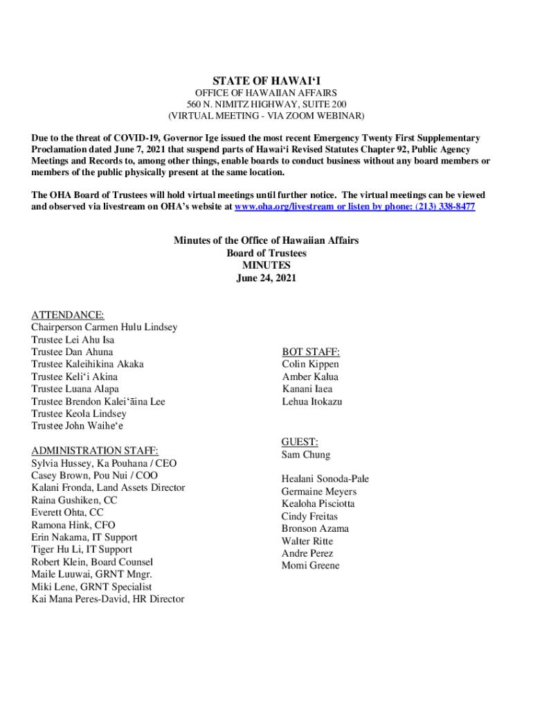 STATE OF HAWAII OFFICE OF HAWAIIAN AFFAIRS 560 N. NIMITZ HIGHWAY, SUITE 200 (VIRTUAL MEETING VIA ZOOM WEBINAR) Due to the threat of COVID-19, Governor IGE issued the most recent Emergency Twenty First