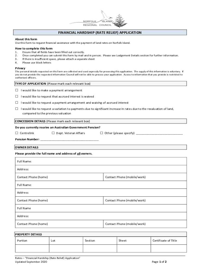 FINANCIAL HARDSHIP (RATE RELIEF) APPLICATION About this form Use this form to request financial assistance with the payment of land rates on Norfolk Island. How to complete this form 1. 2. 3. 4. Ensure