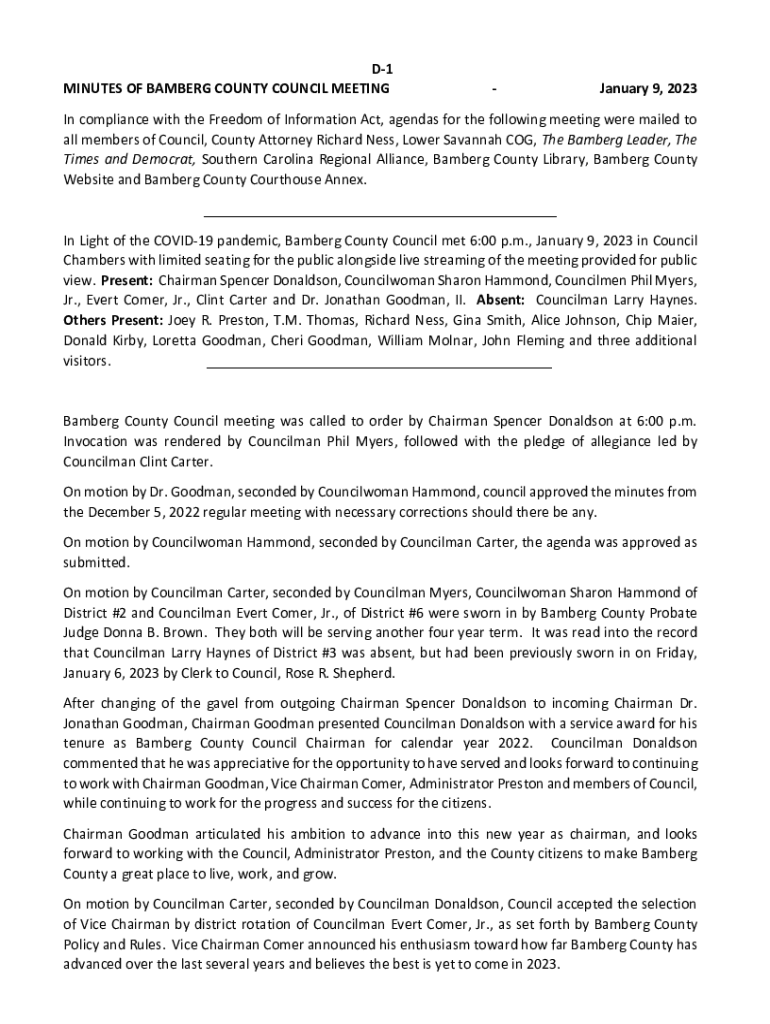 D1 MINUTES OF BAMBERG COUNTY COUNCIL MEETING January 9, 2023In compliance with the Freedom of Information Act, agendas for the following meeting were mailed to all members of Council, County Attorney