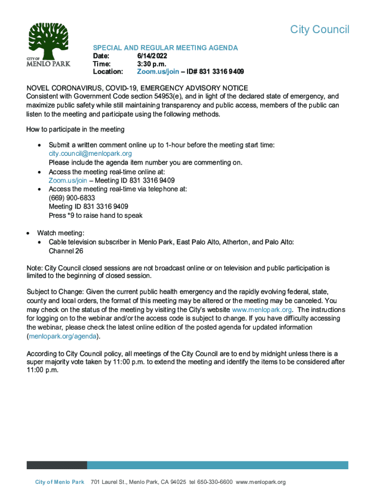 City Council SPECIAL AND REGULAR MEETING AGENDA Date: 6/14/2022 Time: 3:30 p.m. Location: Zoom.us/join ID# 831 3316 9409 NOVEL CORONAVIRUS, COVID-19, EMERGENCY ADVISORY NOTICE Consistent with Government