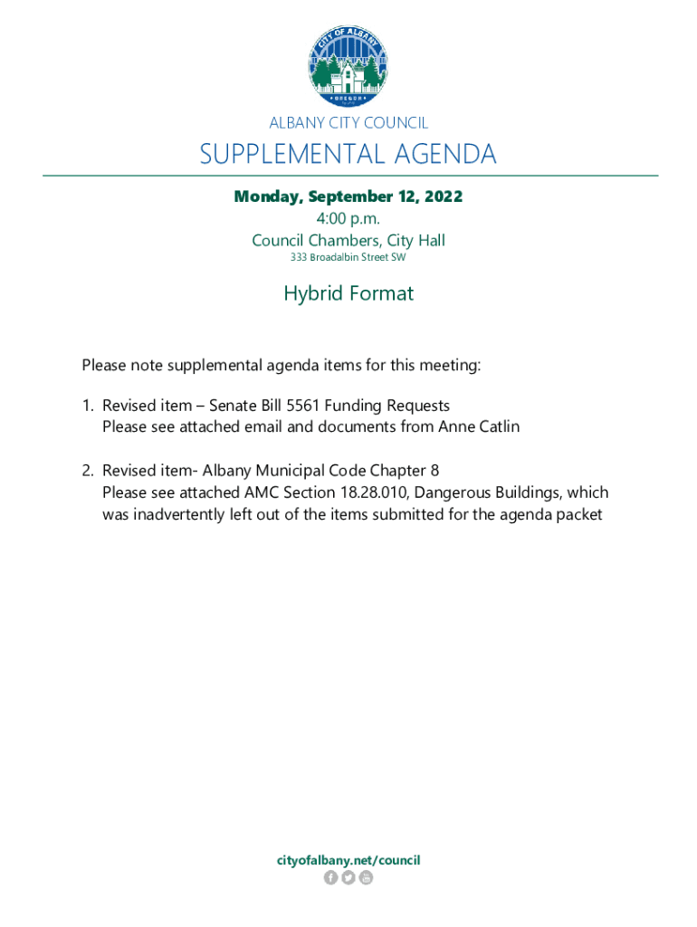ALBANY CITY COUNCILSUPPLEMENTAL AGENDA Monday, September 12, 2022 4:00 p.m. Council Chambers, City Hall 333 Broadalbin Street Hybrid Format Please note supplemental agenda items for this meeting: