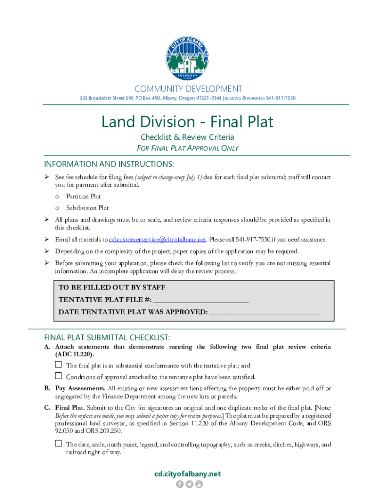 COMMUNITY DEVELOPMENT333 Broadalbin Street SW, PO Box 490, Albany, Oregon 973210144 | BUILDING & PLANNING 5419177550Land Division Final Plat Checklist & Review Criteria FOR FINAL PLAT APPROVAL ONLYINFORMATION