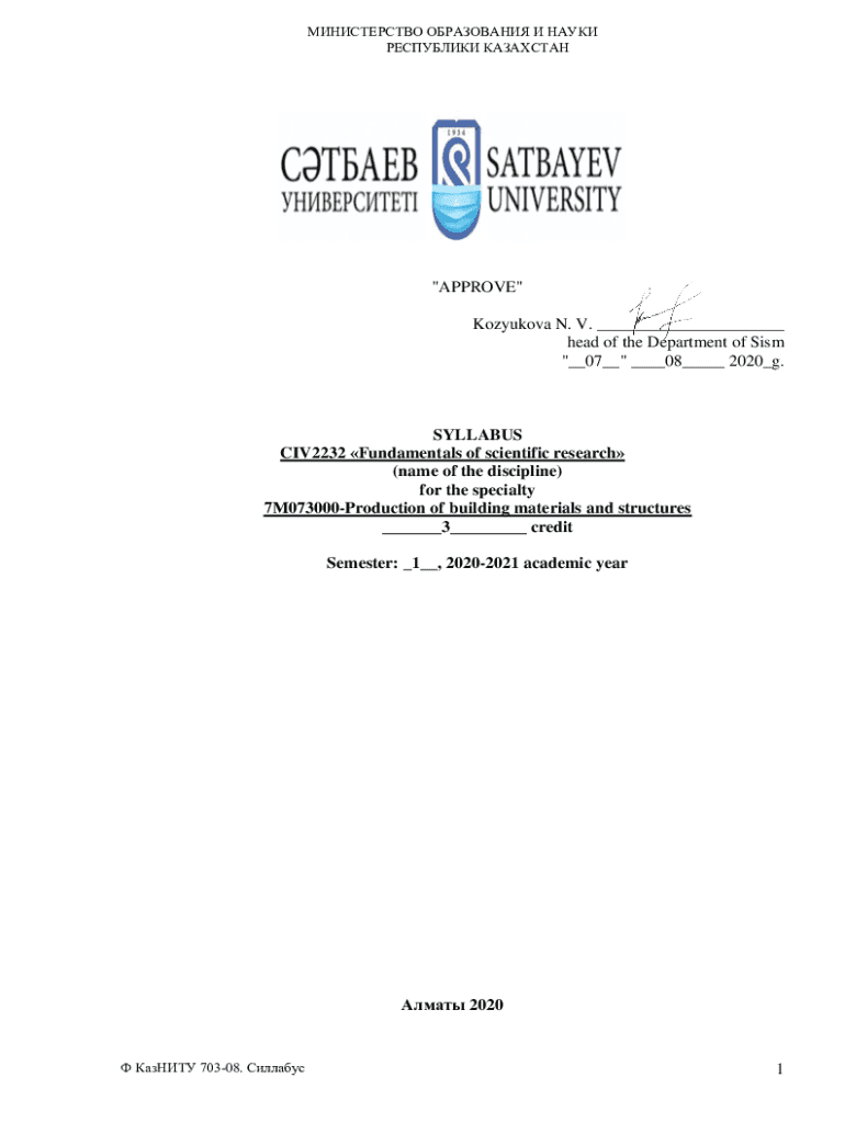 \” APPROVE\” Kozyukova N. V. ___ head of the Department of Sims \” __07__\” ___08___ 2020_g.SYLLABUS CIV2232 Fundamentals of scientific research (name of the discipline) for the specialty