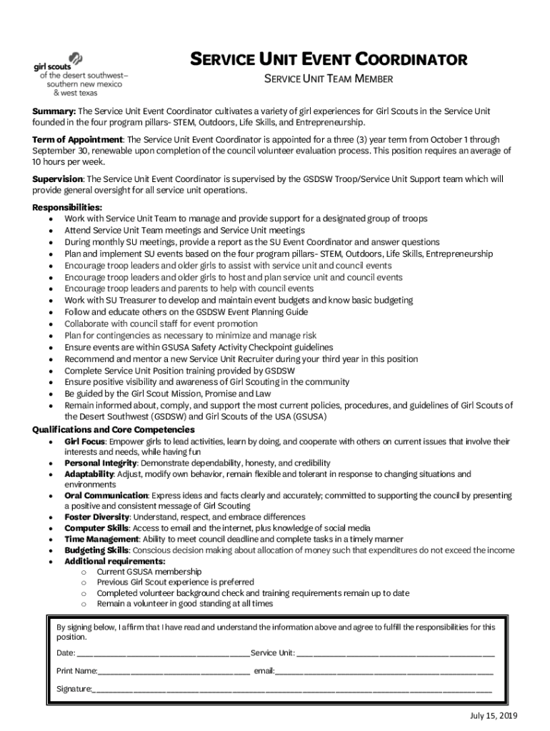 Get the free Service Unit Event Coordinator Position Description. Event Coordinator